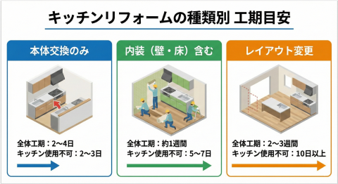 給排水管やガス管の移設、電気配線の延長、壁の造作(大工工事)など、多岐にわたる工事が発生するため、通常は2週間から3週間程度の期間が必要です。この場合、キッチンが使えない期間が長期間に及ぶため、食事や生活の対策がより重要になります。