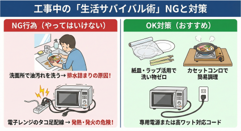 キッチンが使えない間、外食やお弁当で済ませるのも一つの手ですが、毎日続くと食費がかさみ栄養も偏ります。リビングにカセットコンロや電子レンジを移動して簡易調理をするのがおすすめですが、ここで注意点があります。